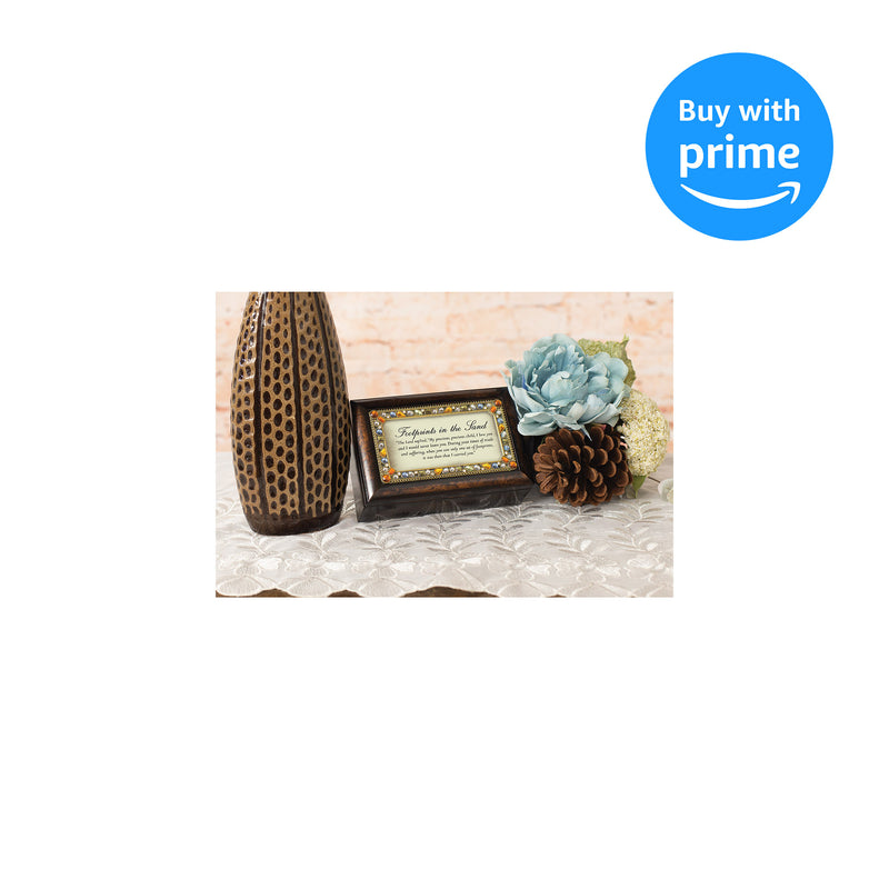 Cottage Garden inspirational and sentimental products are both lovely and classic in style. Be encouraged by a message that reads, "Footprints in the sand. The Lord replied, my precious, precious child, I love you and would never leave you. During your times of trial and suffering, when you saw only one set of footprints, it was then that I carried you." Designed by artists in the Heartland of America, Cottage GardenÕs Collections reach a variety of tastes and have a wide range of occasions for gifting. Woodgrain finish gives this music box a class look. Lovely beaded jewel details frame the hinged lid. Measures approximately 6 x 4 x 2.5 inches; Replace artwork with 4 x 2 inch personal photo. Traditional wind-up mechanism engages music to play melodic tune On Eagles Wings. Black velvet lined interior cushions your precious treasures; Decorative bun feet are padded to protect table top and shelf surfaces. Ships in protective packaging; Ready for giving to that special someone. Poem by Margaret Fishback Powers