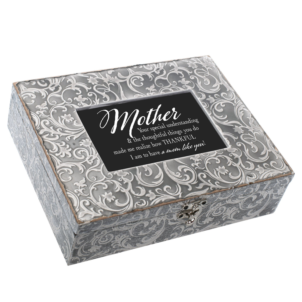 Cottage Garden inspirational and sentimental products are both lovely and classic in style. Be encouraged by message that reads, "Mother your special understanding & the thoughtful things you do made me realize how thankful I am to have a mom like you." Designed by artist in the Heartland of America, Cottage Garden’s Collections reach a variety of tastes and have a wide range of occasions for gifting. Exquisitely embossed filigree parchment paper with a protected enamel finish overlaying a solid wood box; Hinged lid frame with swing clasp Jewelry box measures approximately 9.5 x 7.5 x 2.6 inches; Replace artwork with 4 x 6 inch personal photo Traditional wind-up mechanism engages music to play melodic tune Wind Beneath My Wings Made of solid wood material; Designed with distressed, weathered white interior finish Ships in protective packaging; Ready for giving to that special someone